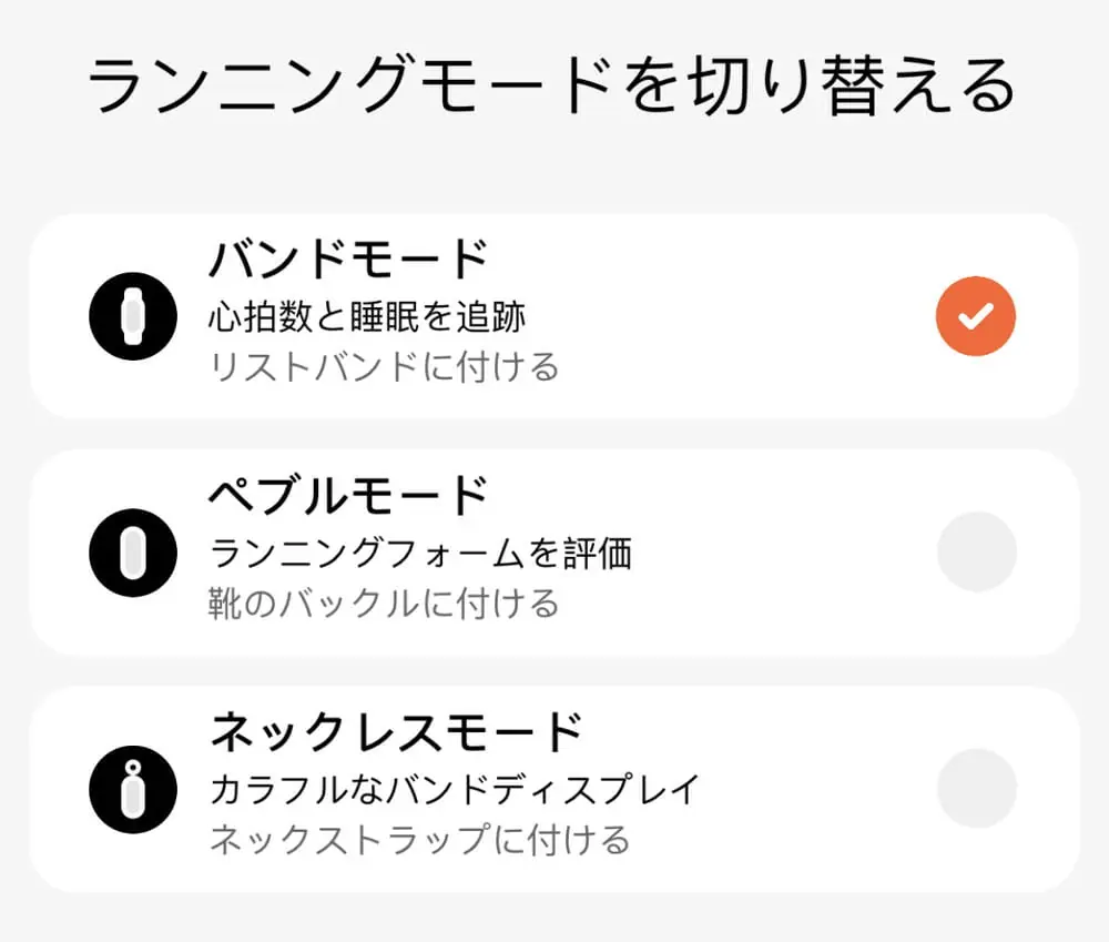 前述した通り、Mi Band8はストラップの脱着が可能であり、様々な身に着け方を楽しめる。装着方法に対応したモードが用意されている点は嬉しい。