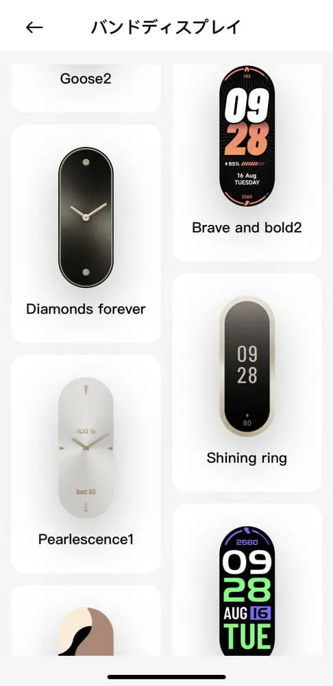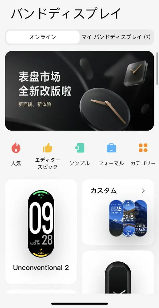 アプリから無料のテーマをインストールすることで、スマートバンドのホーム画面(ウォッチフェイス)のデザインを自由に変更することも可能だ。