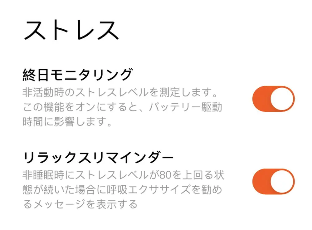 本製品には健康モニタリング機能が備わっており、ストレス・睡眠・心拍数・血中酸素飽和濃度などの数値を24時間監視(トラッキング)し、データとして可視化・保存しておくことが出来る。