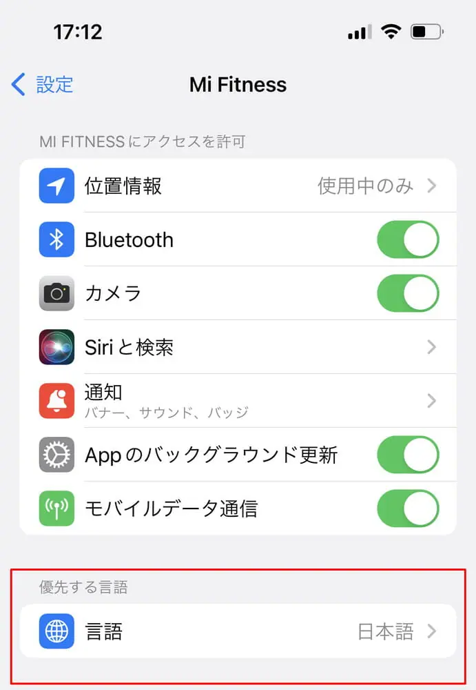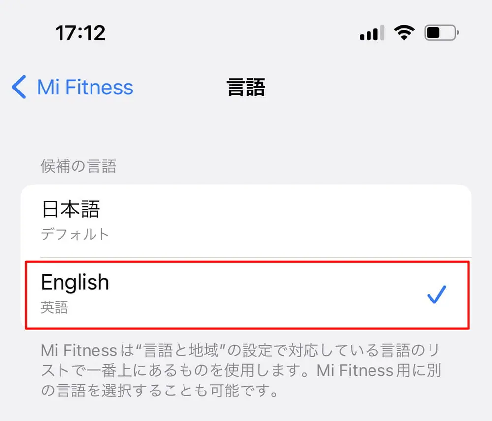 完了後、「Mi Fitness」アプリを再起動すると、アプリ内表記が英語に変更されている。