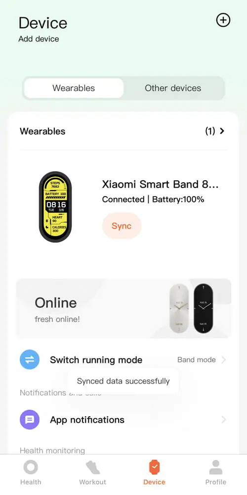 アプリ(スマホ・タブレット端末)とのペアリングが完了すると、端末上でスマートバンドの状態を確認したり、データの分析や機能のカスタマイズなどを行うことが可能となる。