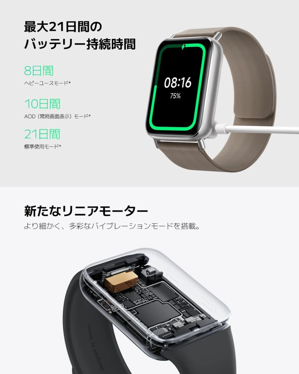 | バッテリー持続時間 | 通常モード:約21日 AODモード:約10日 高負荷モード:約8日 |