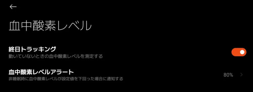 血中酸素レベルはMi Fitnessアプリ側で、終日トラッキングをオンにできる。