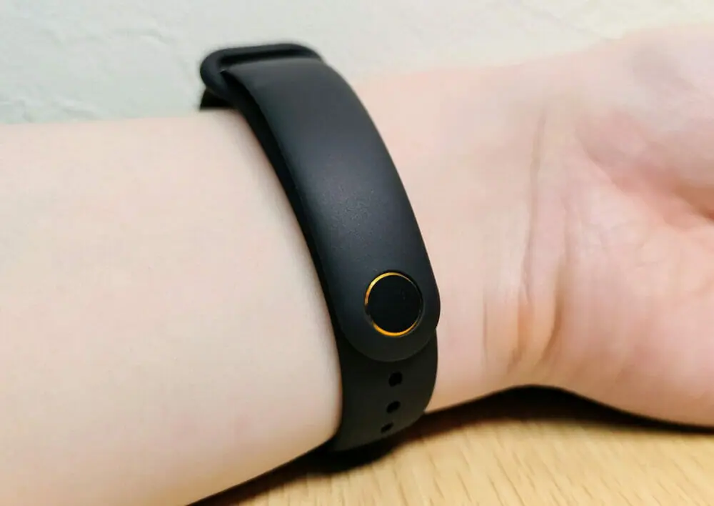 Xiaomi スマートバンド 7 NFC版では留め具が金色のリングで装飾されている。