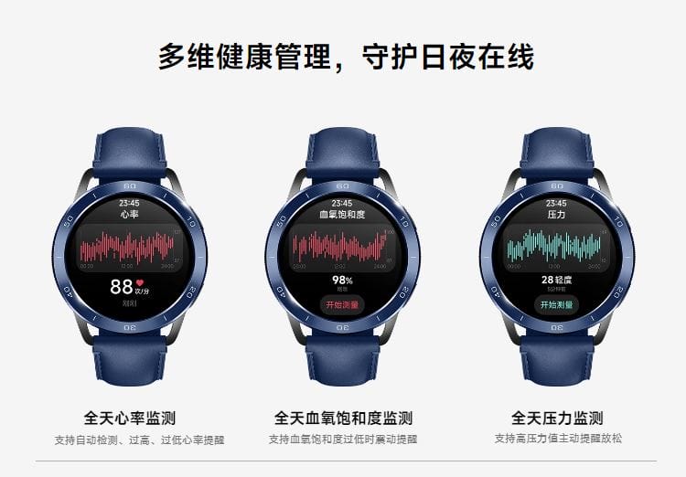 心拍数モニター、SpO2センサー、睡眠トラッカー、女性用の月経周期モニターなどの健康管理機能を搭載。ストレス値の視覚化も可能。