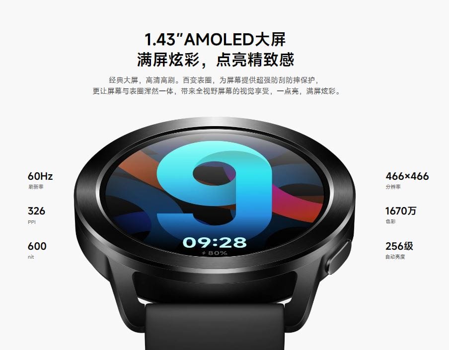 『Xiaomi Watch S3』は、1.43インチのAMOLEDディスプレイを搭載し、466×466ピクセルの解像度に対応。60Hzリフレッシュレート、600 nitsのピーク輝度に対応するなど、従来モデルから描画面での向上が見られる。常時表示にも対応。