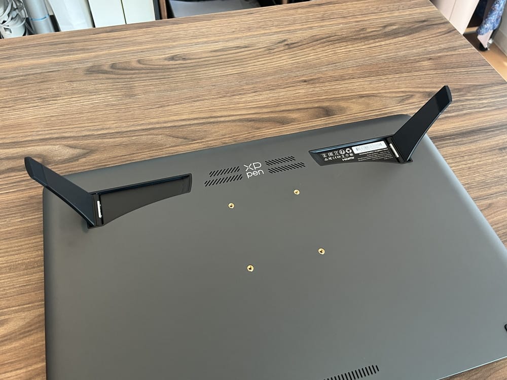 スタンドを展開することで、イスに座りながらちょうど良い角度で液タブに描くことができ、身体への負担を抑えられる。