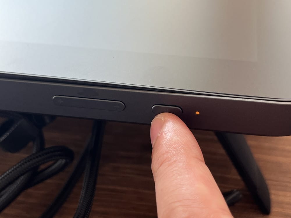 液タブ上部の電源ボタンを3秒間長押しすると、ランプが青と黄色に点滅し、板タブモードとなる。