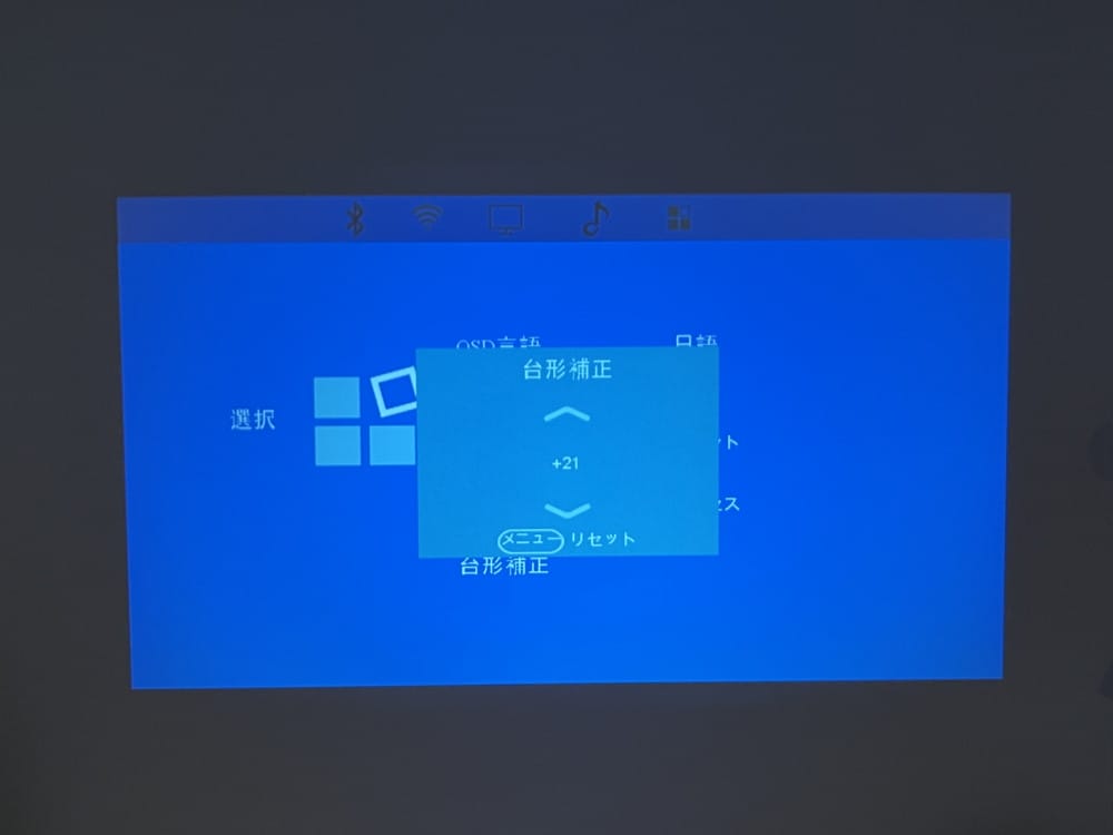また、照射映像がきれいな長方形になっていない場合(台形になってしまっている場合)、設定画面を開き、台形補正機能を利用しよう。