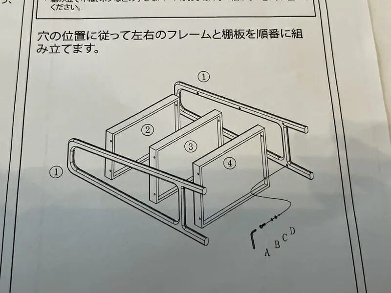 組み立てに関しては、説明書の指示通りにフレームと棚板を組み合わせて、上述したボルト&ワッシャーを穴に入れていくだけだ。
