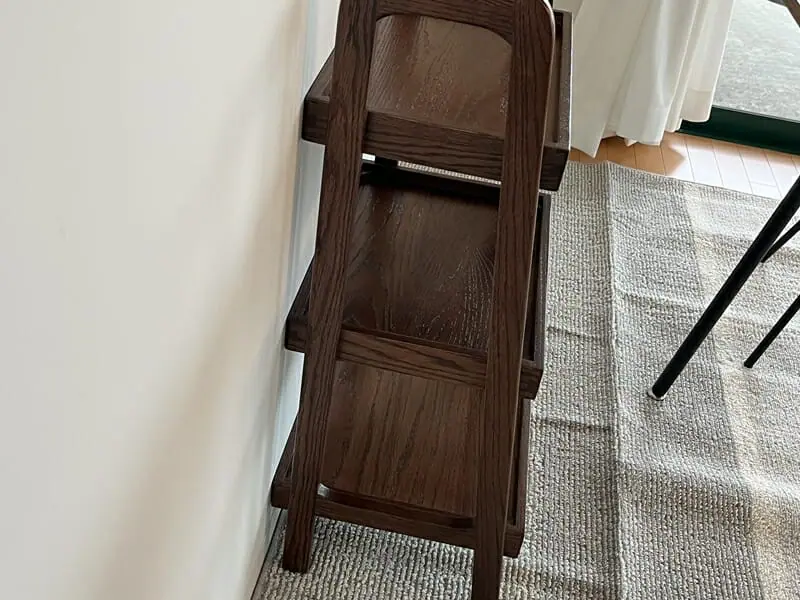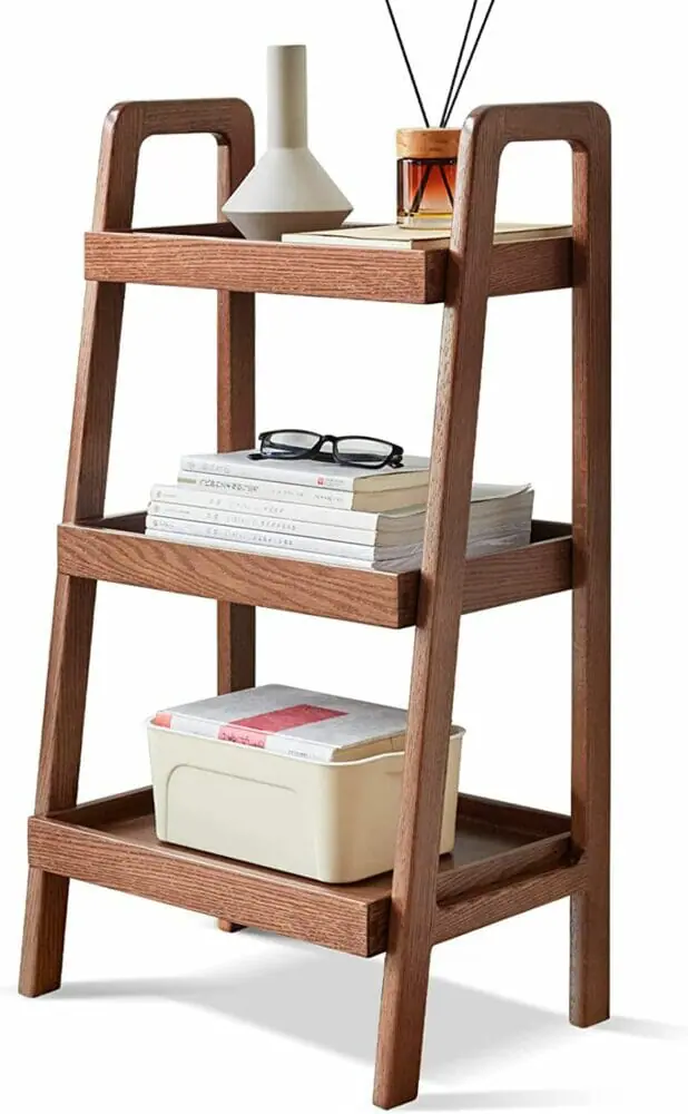 組み立て式だが、複雑な組立手順を必要とせず、穴の位置に従って左右のフレームと棚板を順番に組み立てるだけで気軽に組立てが可能。一人暮らしの方、女性の方、組み立ての苦手な方でも安心に利用できる。洗練されたデザインと美しい木目で上品さにあふれており、リビングルームやベッドルームに置いても、高級感と落ち着いた雰囲気を演出できる見た目だ。