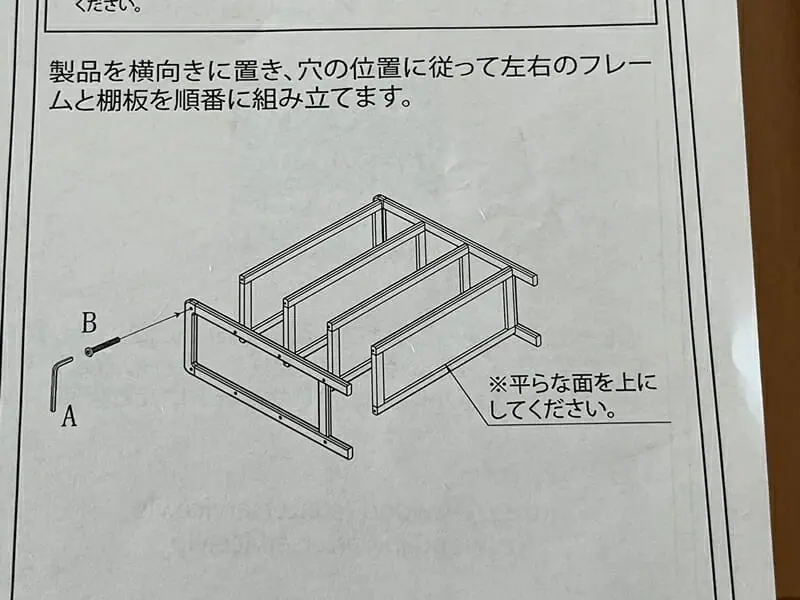 組み立てに関しては、フレームと棚板を組み合わせて、上述したボルト&ワッシャーを穴に入れていくだけだ。