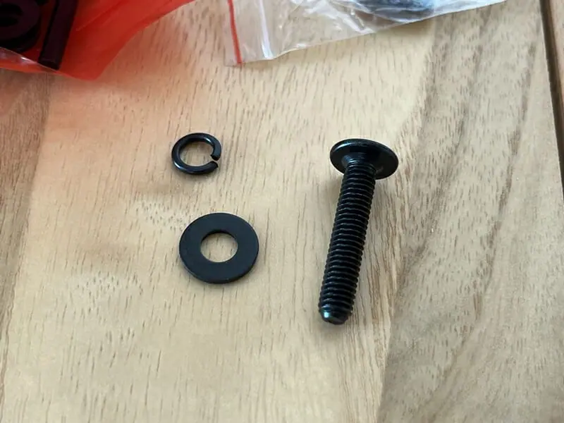 ▼恐らくは、同ブランドの他製品の場合と同様、ボルトにスプリングワッシャー⇒フラットワッシャーの順で入れ、ネジ穴に締めていくのが正解と思われる。
