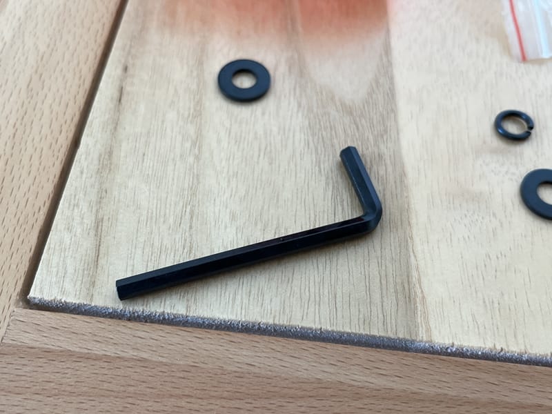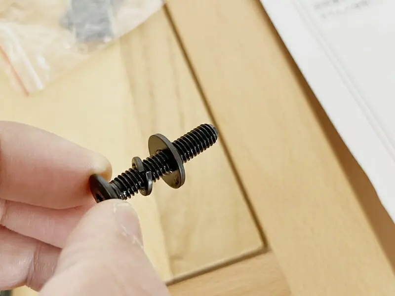ボルト1種類、スプリングワッシャー1種類、フラットワッシャー1種類を付属する六角レンチで締めていくだけなので、この手の組み立てが苦手な方でも心配する必要は無い。