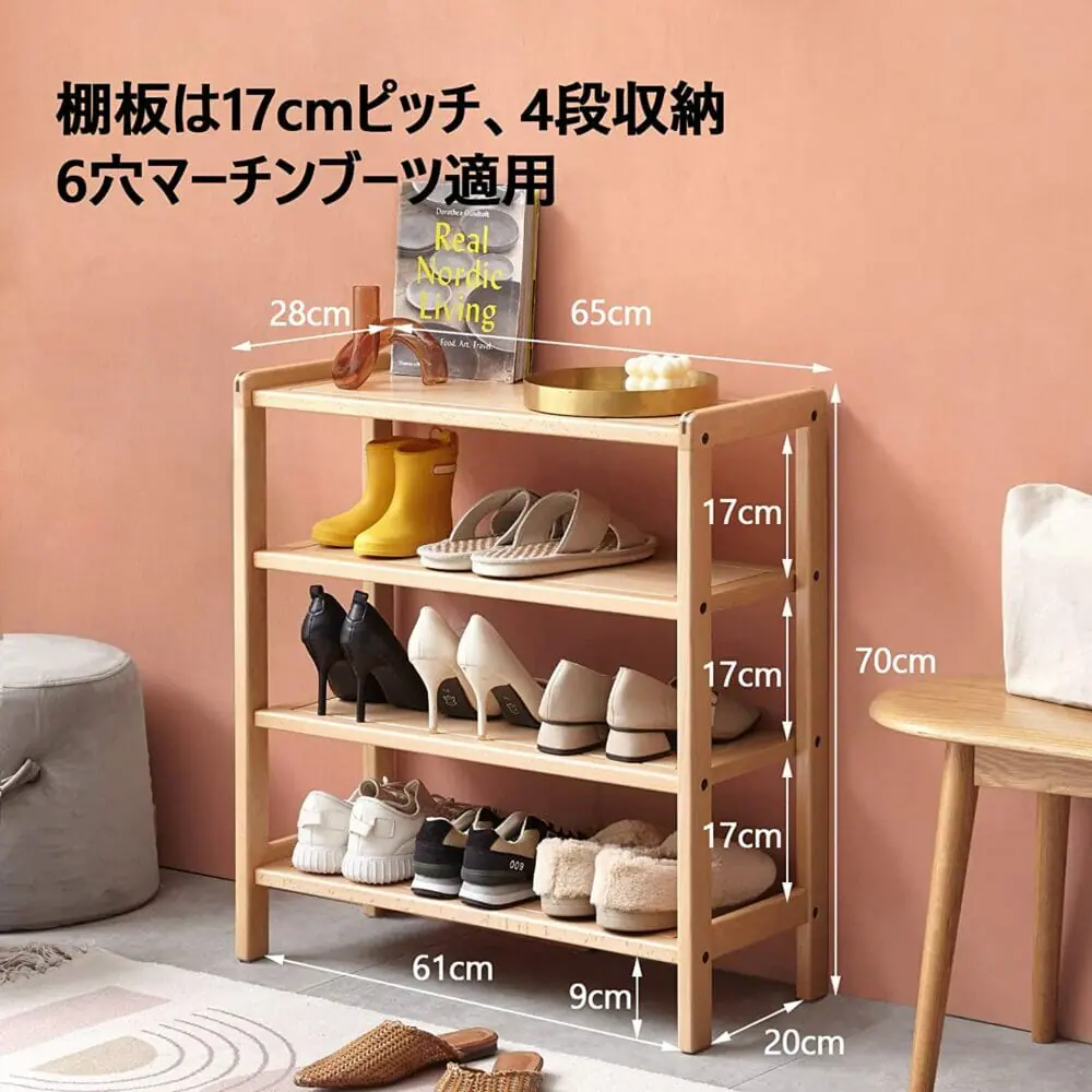 65×28×70cmというサイズで、家族の靴を全て収納でき、スペースをほとんどとらない。棚板は17cmピッチで6穴マーチンブーツも収納することが可能であり、各段に靴を3足置いても十分な収納性を備えている。