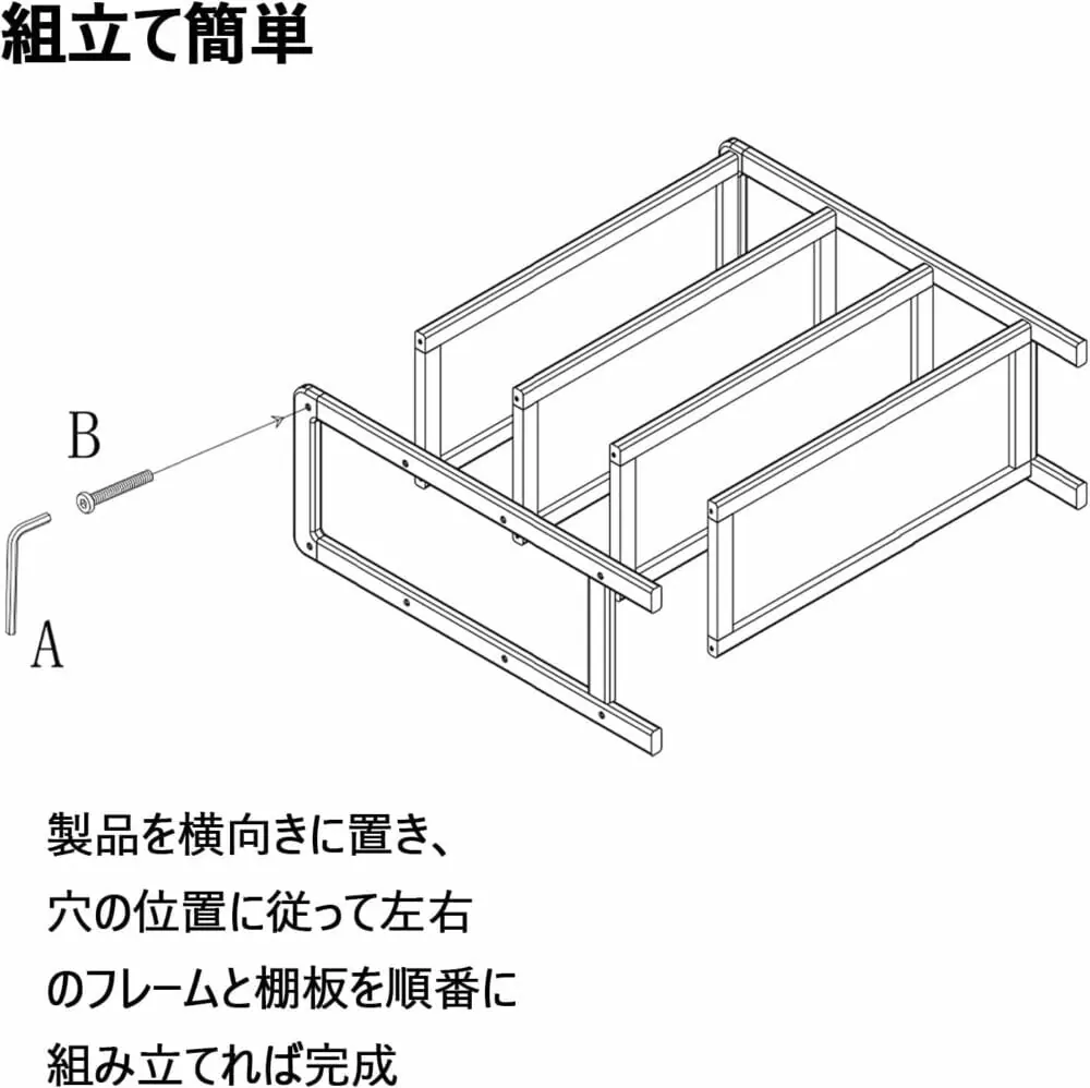 組み立てに関しても複雑な手順は不要で、誰でも簡単に組み立てることができる。時間を取らず、製品を横向きに置き、穴の位置に従って左右のフレームと棚板を順番に組み立てるだけで完了する。