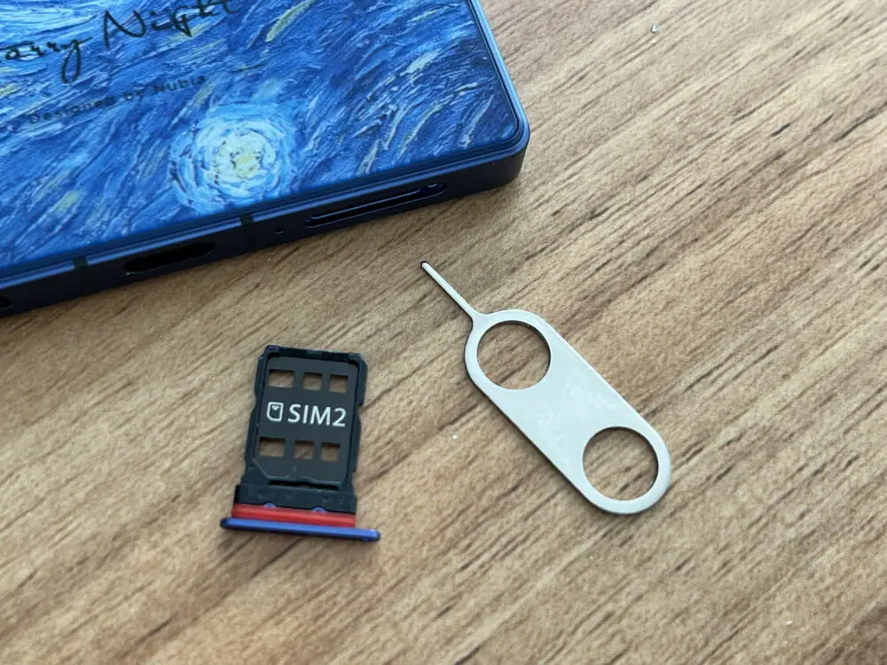 ▼付属のピンを用いてスロットを開き、デュアルnanoSIMカードの挿入が可能。