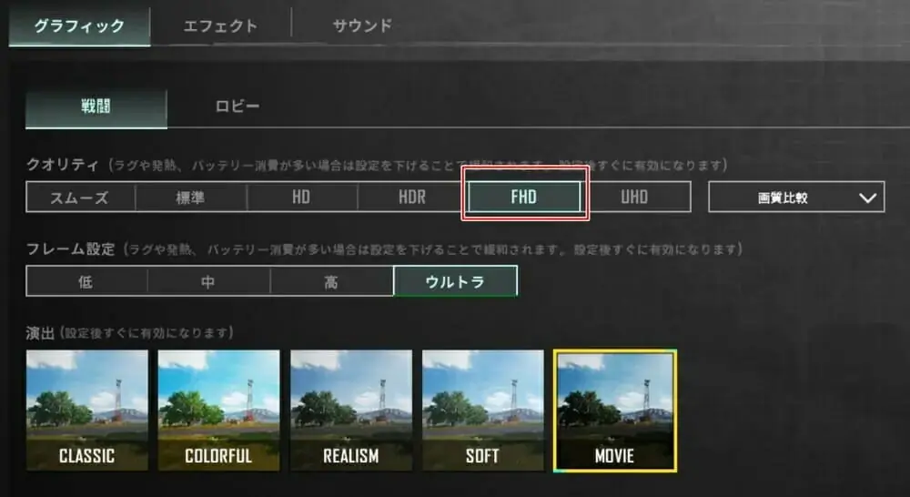 まずグラフィッククオリティに関しては、現時点で最高設定である『FHD』を選択することが出来た。