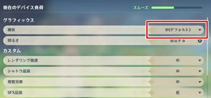▼画質設定はデフォルト状態で "中" に設定されており、デバイス負荷は "スムーズ" の状態。